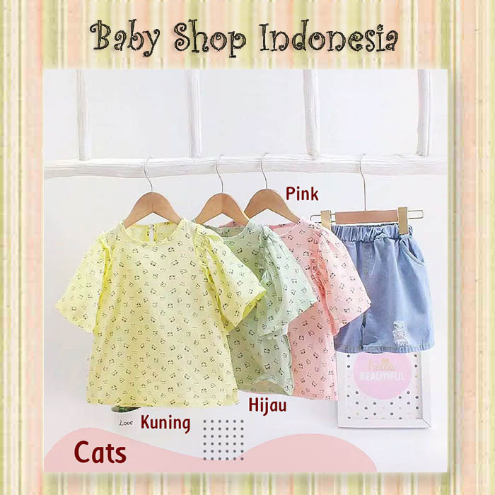 Setelan Blouse Anak Perempuan Import Atasan Katun Anak Cats Celana Pendek Denim Anak