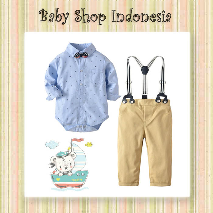Bahan katun halus, baju kancing hidup, dasi bisa dilepas, celana pinggang belakang karet, termasuk suspender.