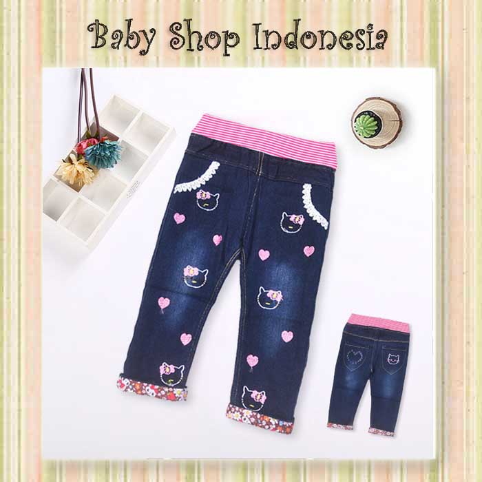 Bahan softjeans, pinggang fullkaret, motif bordir.