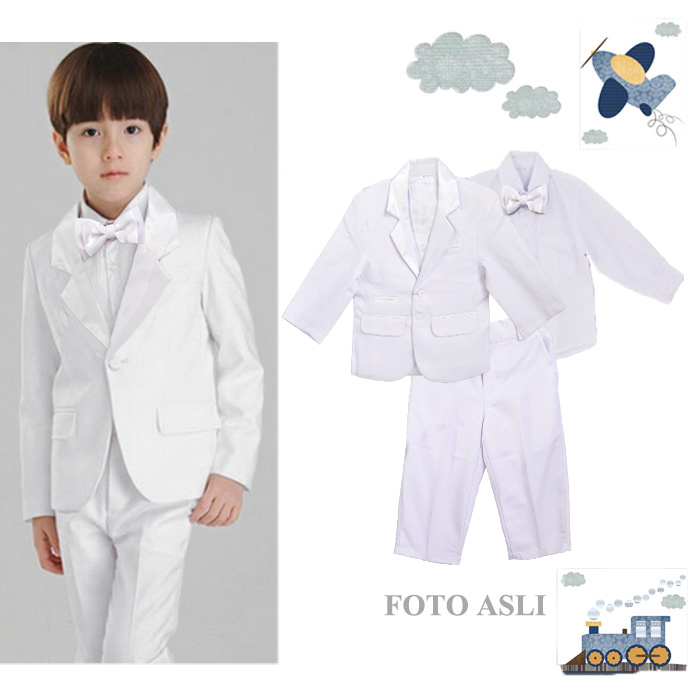 Setelan jas anak, sudah termasuk kemeja putih lengan panjang, jas putih ,dasi, celana panjang (karet setengah lingkar pinggang).
