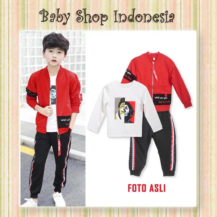 Set terdiri dari kaos lengan panjang+ jaket+ celana, bahan kaos halus adem.