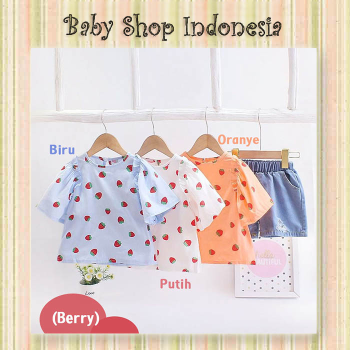 Setelan Blouse Anak Perempuan Import Atasan Katun Anak Strawberry Celana Pendek Denim Anak